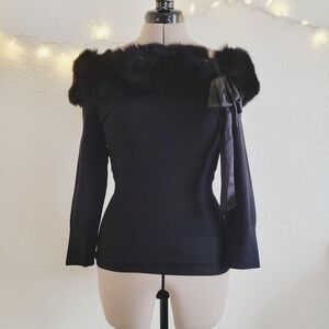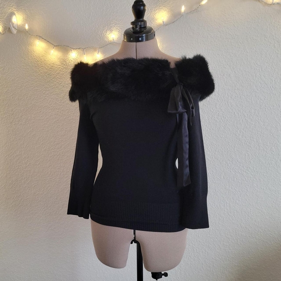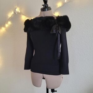 ☆ Beautiful off-the-shoulder bodyhugging fit, soft glossy rabbit fur neckline, satin interior to avoid itch, and a satin bow on the front. I believe the knit body is a silk blend.