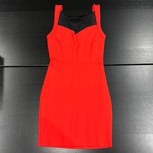 Bebe Red Bodycon Mini Dress with Mesh Inserts in size XS. No flaws or signs of use. Lined skirt. Black parts are mesh and sheer. Stretchy fabric but very sturdy, so it is very figure flattering. Cute mesh open back detail. Please refer to photos for exact size, details, and condition.