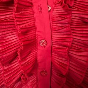 Look chic and professional with this bright red Bebe ruffle top. Pair with a pleated skirt and accessories for a more casual look. Pair with jeans/slacks for a more professional look :) There are many ways to put this piece together, you have to get creative!