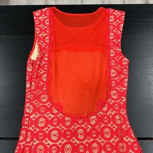 Bebe Red Lined Lace Bodycon Mini Dress with Mesh Inserts in size XS. Brand new without tags. Never worn or used. No flaws or signs of wear. Red lace is lined with a tan slip. Low back detail with a mesh insert for a sexy sheer look. The neckline is also the sheer red mesh. Lace overlaps the mesh which adds a feminine touch. Measurements are shown in photos. Size and brand tags were removed from around mesh, as they’d show while wearing.