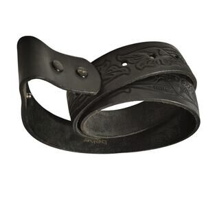 Bebe replacement leather belt strap tooled floral engraved pattern. Snap closure to easily attach your own buckle. Flowers and leaves throughout the entire belt. Almond shaped belt tip. Six belt holes.