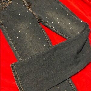 NWT Bebe blue jeans with rhinestones on the front. Straight leg, 5 pockets, 32” inseam.