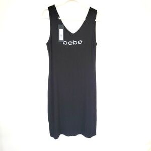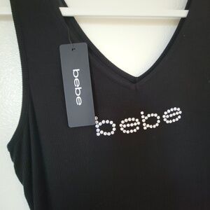 Bebe Rhinestone Logo Rib Tank Dress. Ribbed, v-neck, stretchy fabric. 95% rayon, 5% spandex.