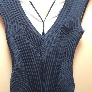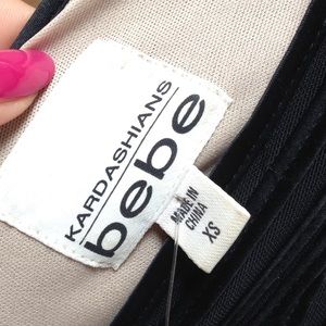 Classy and sexy little black cocktail dress from Bebe (kardashian collection) - NWT. RIbbed texture. Black outer with nude lining. Body is nylon and spandex ; outer contrast is silk and spandex. Size XS. Deep v front neck - back has cutout keyhole detail. My lighting is a lil funky but color is true black. No trades!