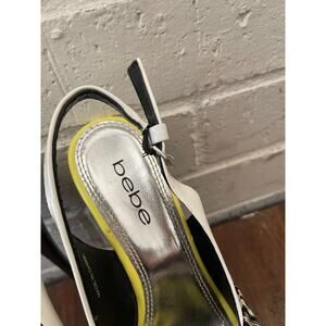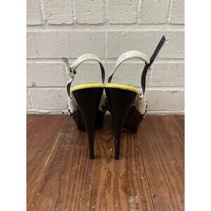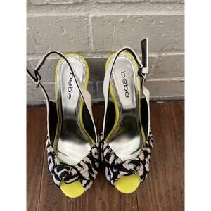 Bebe Roxanne Black/White/Neon Yellow Peep Toe Slingback 5" Platform Heel Size 5