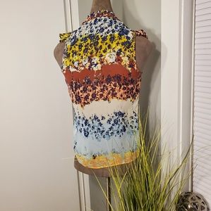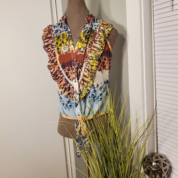 Floral top featuring ruffle accents and colorful pattern. Gold button hardware for a clean look. Front tie at bottom for a girly look. Pair with light or dark washed skinny jeans. Bonus: Ditch the heels and wear flat open-toe sandals.