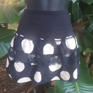 This kicky little skirt is short and sweet..Knit waistband is comfortable and segues to plolka dot lace trimmed chiffon rufflesheld out by...are you ready? A tiny crinoline....i think minnie mouse left this backstage...in excellent condition.....