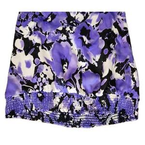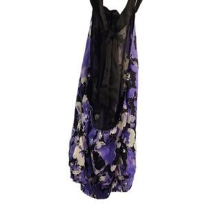 Stunning 100% Silk tie v-neck Halter top by bebe with purple floral and black design. Elastic-type rouching at waist. Backless, sleeveless and lined. In very good pre-owned condition. Measurements: 15" pit to pit, 31" waist, 24" length from top of Shoulder to hem.