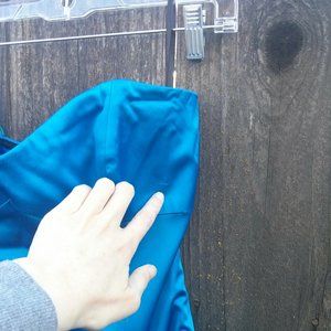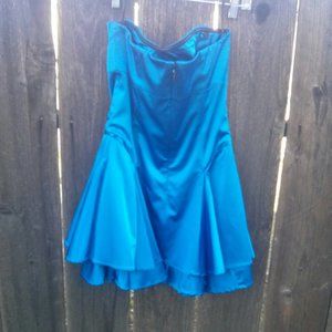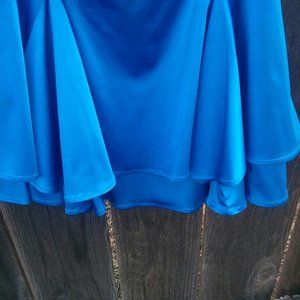 Blue satin strapless bustier dress. Sweetheart neckline, flattering seam details, side boning. Beautiful blue. Fit and flare with a tiered flounce/slightly ruffled skirt. Back zip. Small snag on right side of bustier- see close ups. And some indentations from the hanger clips. Photo with the white backdrop was taken in doors to show color in differing light conditions.