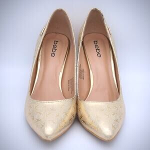 Bebe Saydee Logo Pumps Heels 7.5 Gold Vegan Pointy Toe Shoes Stiletto Classic