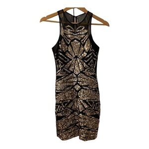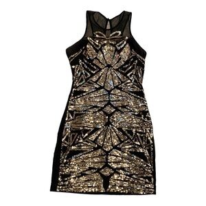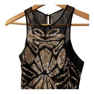 Racerback dress dazzling with luxe geo-sequin pattern and mesh illusion yoke. Back keyhole opening. Button-loop and hidden back zip closures. Partially lined.