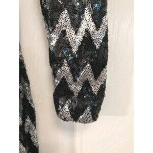 The Bebe Silver Black Chevron Sequin One Shoulder Bodycon Cocktail Dress in size XS is a stunning and sexy formal dress perfect for weddings, cocktail events, or nights out. The dress features a one-shoulder design with one long sleeve and a zipper closure. Made from polyester and covered in sequins, this dress has a stretchy fabric for a comfortable fit. The chevron pattern and silver accents add a touch of glamour to this above-the-knee mini dress from the trendy brand Bebe, making it a stylish choice for any occasion.