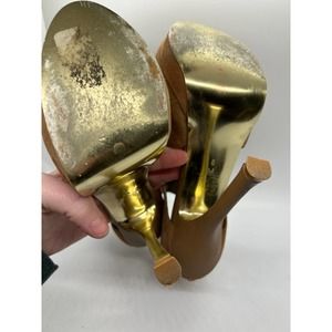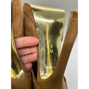 Bebe Size 8M Ultra High Suede Tan Heels with Strappy Design on Foot