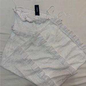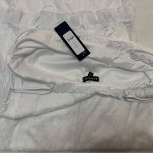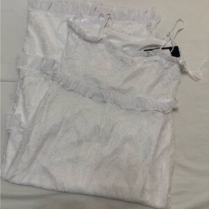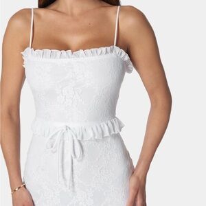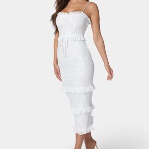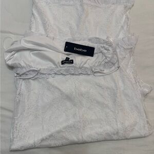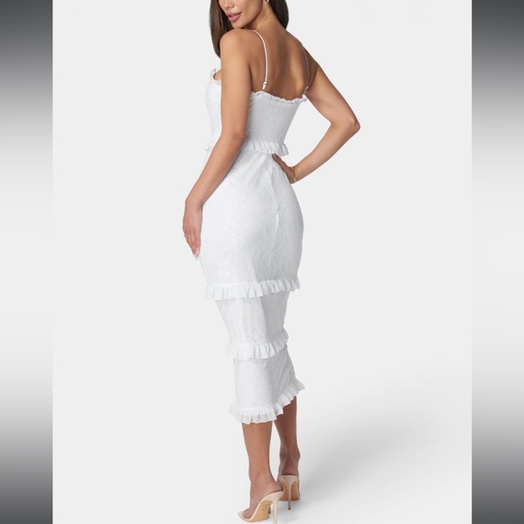 The Bebe White Spaghetti Strap Bodycon Midi Dress is a stunning choice for bridal events or cocktail parties. This sleeveless dress features a sleek bodycon fit that accentuates the silhouette, while the spaghetti straps add a touch of elegance. Crafted in a pure white hue, it offers a fresh and sophisticated look for any special occasion.