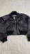 The sleek black satin exterior and ribbed knit cuffs and collar add a touch of sporty chic. Perfect for layering over any outfit, this jacket offers a comfortable and flattering fit. The cropped length adds a modern twist to a classic silhouette.