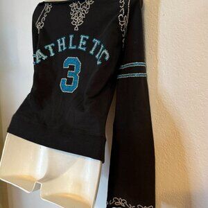 This off-shoulder zip-up top from Bebe Sport combines stylish embellishments with a sporty aesthetic. The intricate beadwork, bell sleeves, and bold "Athletic 3" lettering ensure a balance of fashion and functionality. Tailored for a medium fit, it is a versatile addition to your wardrobe.