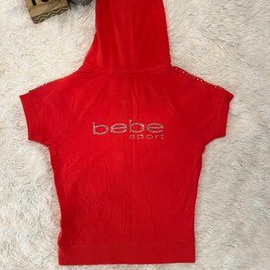 This comfy cutie is a pretty deep coral color with signature Bebe Sport logo in rhinestones on the back of the cropped hoodie and on the back of the capri pant. It also is embellished with rhinestones down the cropped hoodie shoulder and down along the capri legs.