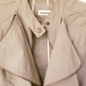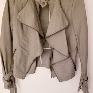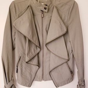 Light Gray, light weight jacket with zipper lined folds. Sleeves are long and pretty perfect for someone with long arms. Newish condition, rarely worn