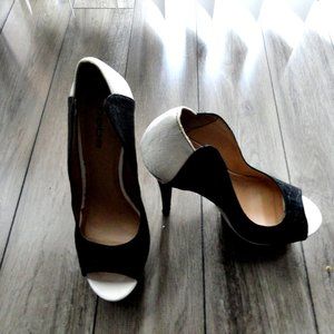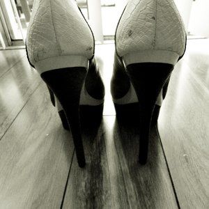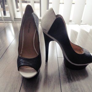 Pre-owned Bebe Peeptoe Platform. Great condition. The outer leather of the back portion of shoe, has tiny stains, but still very nice looking shoes. You can wear this at any occasions.
