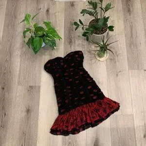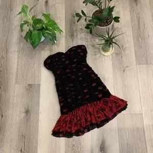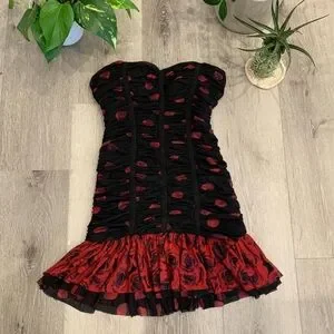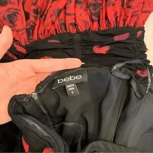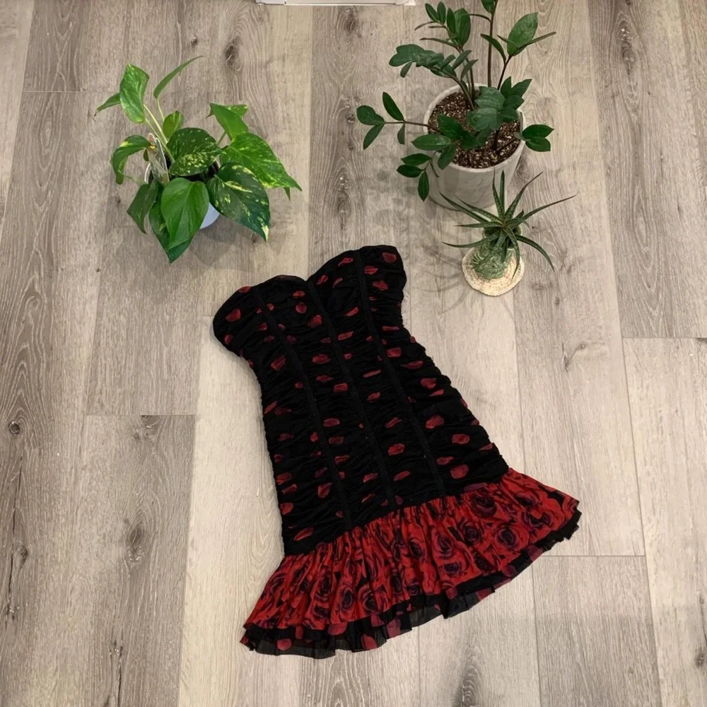 Strapless bebe mini dress in black with red rose print. Ruched bodice and gathered waist. Feminine ruffled skirt detail. Sleek and bold look for evening wear.