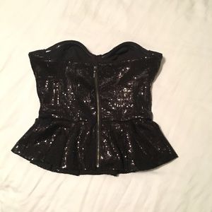 ▪️Black strapless sequin peplum top with zipper and top clasp closure. Built in underwire bust with light padding for no show through. EUC