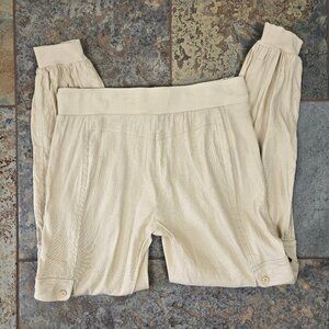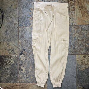 Cream colored pull on style joggers have a stretchy waistband with a drawstring in the front. Two slant style front pockets. Cargo pockets with button flaps on each leg. Ribbed cuff at bottom leg hem. Lightweight.