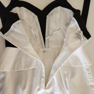 Y2K BEBE Claire Classic Black and White Colorblock Peplum Mini Body Fitting Dress. Flattering sweetheart neckline, peplum waist, and sleek sleeveless design. Fully lined for a smooth fit and secured with a zipper back closure
