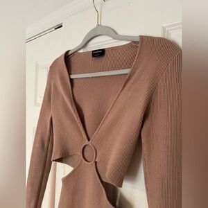 This elegant tan ribbed dress features a chic cut-out design, perfect for any occasion. Its soft fabric and flattering fit make it a must-have addition to your wardrobe.