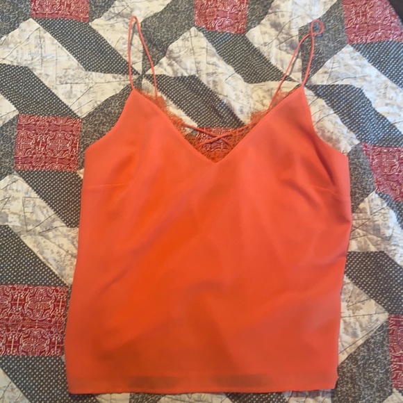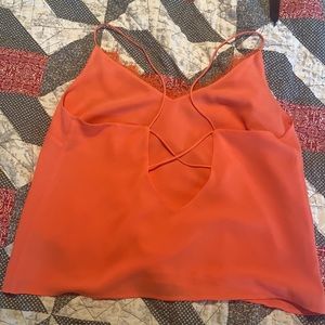Bebe tank top. Salmon colored. Spaghetti strap with lace detail in front. Back has open criss cross design. Very flowy. Size large.