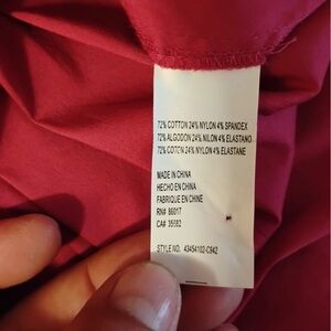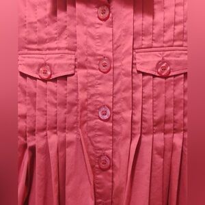 Very good used condition long sleeve light weight pleated pink blouse from Bebe. Cargo style pockets with pleats on the bottom. Only flaw is that you can see some stitches pulling on the arm, no hole though.