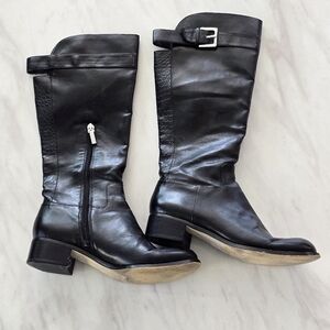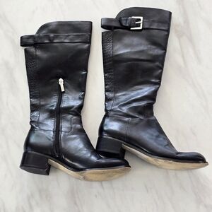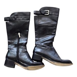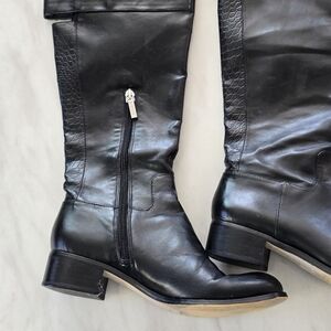 Bebe Thigh Boots Women Sz 6 Black Leather Knee Zipper Animal Print Block…