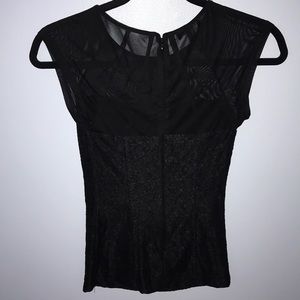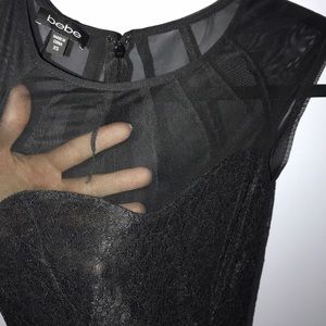 Zip up back, see thru mesh on the top and shoulders. Lace over lay. Worn once
