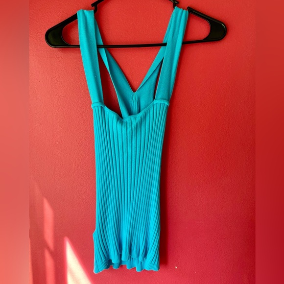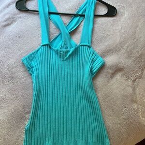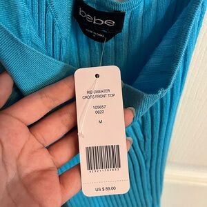 Bebe rib sweater cross front top in beautiful “scuba blue” color, size M. Never worn, NWT, originally $89.