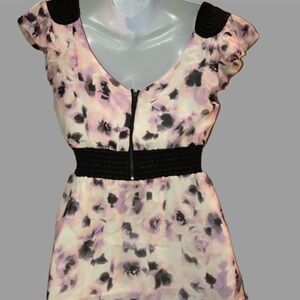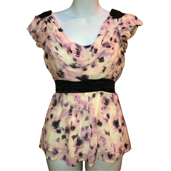 Bebe Pink and black floral print babydoll top with a cowl neck and short sleeves, featuring a black velvet trim at the neck and a black velvet bow at the back of the neck. The top is lined.