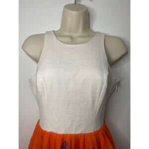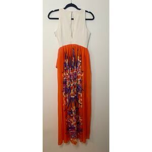 Bebe Tropical Maxi Dress with high/low cut. Size Small. White fitted bodice with flowing orange and purple tropical skirt with asymmetrical slit. Lined and very flattering.