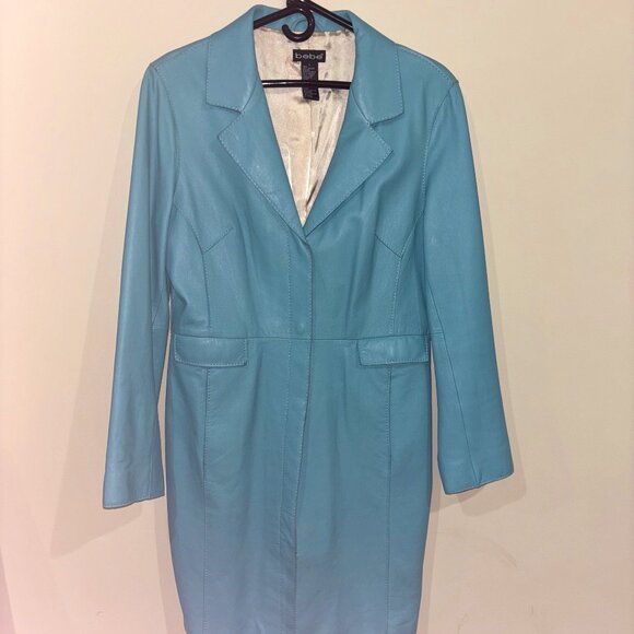 Elevate your wardrobe with this stunning Bebe Women's Turquoise Leather Coat in size Large. Crafted from 100% genuine leather, this coat is as luxurious as it is stylish. The vibrant turquoise color makes it a standout piece for any occasion, while the soft satin lining ensures comfort and elegance.