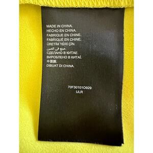 Bright neon yellow Bebe party mini dress with a striking cage effect beaded and chain detail around the neckline and chest. This Y2K style sleeveless dress features a lightweight, airy fabric perfect for summer parties or cocktail events. Fully lined with matching color stretch fabric. Beads and chains are gold color. The elastic waist ensures a flattering fit, making it a standout piece in any wardrobe.