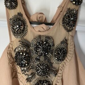 Tag on , never used . Elegant and feminine 100% Silk backless tie-up top, neck embroidery, tan color . Size XS.