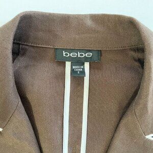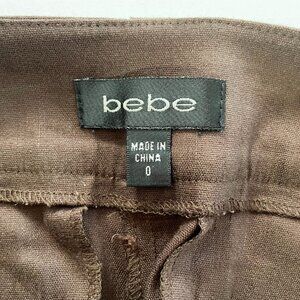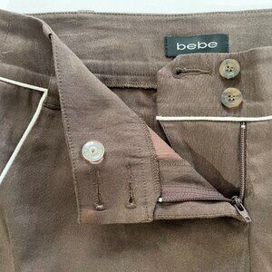 Classy, rare find that exudes quiet luxury. Elegant, vintage Bebe dark rum/brown linen pant suit with white trim, tailored three-button jacket, two-button wide leg pants, and belt with high-end buckle. Quality is evident in cut and material. Pre-owned, in excellent condition - like new. Jacket Size 2. Pants Size 0. Classic sizing is different than today. See measurements in images for actual sizing.