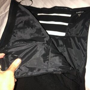 Bebe cocktail dress worn only once. It has a satin V shape accent in upper front/center, connected satin tie around waist (not loose) with cute bow attached in front. The back is detailed with 3 rectangular slits.Boning in chest for shape and silicone lining strip helps to keep dress from sliding down. Side zip. I love this dress! It is somewhat stretchy and very flattering. It has POCKETS & is fully lined.