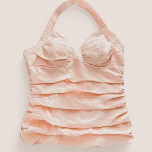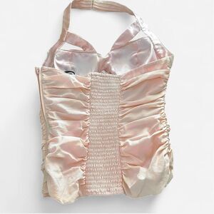 Step into early 2000s glam with this gorgeous vintage Bebe bustier halter top. Made from a mulberry silk blend in soft baby pink, it features a padded sweetheart neckline, pleated front, and smocked back for a flattering fit. Finished with a full side zipper and halter tie for that signature Y2K silhouette.