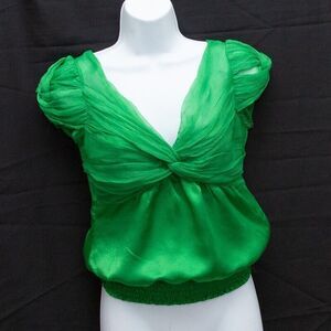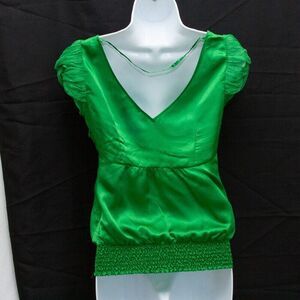 Bebe Vintage Y2K Trendy Green Satin V Neck Short Sleeve Top XS Elastic Waist Lightweight 2 oz