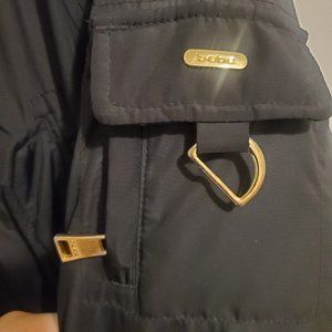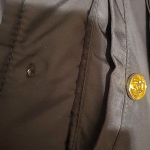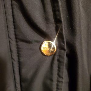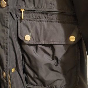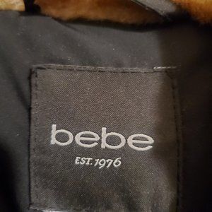 Used black winter coat for women, size Medium, Runs generously. Bebe is known for making things a bit more feminine and extra and this coat is no exception. Beautiful light brown fur-lined hood, missing the fur trim. Gold snap and hardware details. Full zip closure, inside drawstring option for tighter or looser fit, all pockets zip shut for security of items. This coat is very warm and cozy. Lots of snap-close pockets and features, great for cold walks or errands.