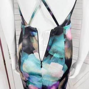 Bebe Watercolor Plunge Neck Open Back Bodycon Y2K Club Dress Black Teal Size XS Black with multicolor watercolor print Stretch scuba fabric Deep plunge neckline Bodycon sheath fit Cross back spaghetti straps Open back Lined Above knee length Back zipper Sleeveless Excellent preowned condition Length shoulder to hem 37" Waist 13" Y2K Sexy Colorful Club Party Cocktail Wedding guest Pencil Summer Dancing Maximalist #DD"