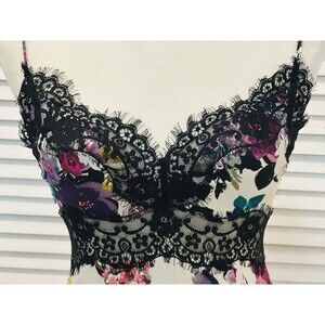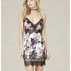 Elevate your style with this stunning Bebe women's mini dress. The dress features a beautiful floral pattern with gothic and whimsigoth elements, making it perfect for any party or casual occasion. The dress is made of lightweight silk fabric with lace accents and a zipper closure, ensuring both comfort and elegance.