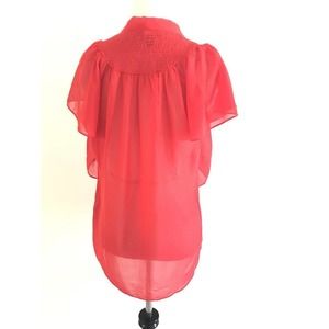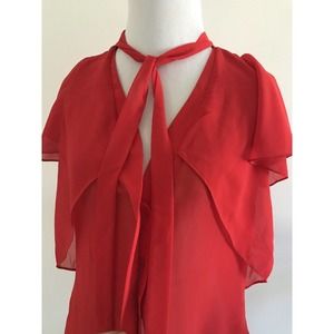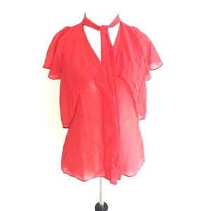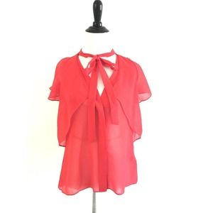 Bebe | Women Size XS Ruffle Button Up Asymmetrical Shirt Neck Tie Cap Sleeve Red