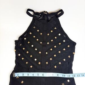 Keywords: Bebe dress, black bodycon dress, gold studded dress, sheer halter dress, XS party dress, night-out outfit, Bebe studded dress, dominate, dom