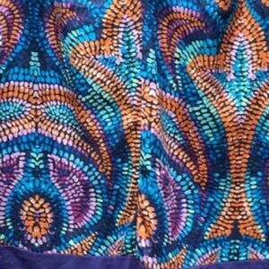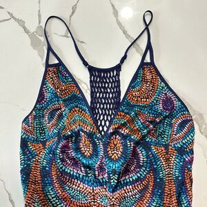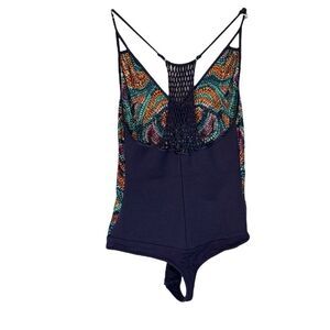 Gorgeous Bodysuit Featuring Rope Tie Pattern in Back, Adjustable Spaghetti Straps, and a Brilliant Color Print in Orange, Blues, and Purple