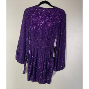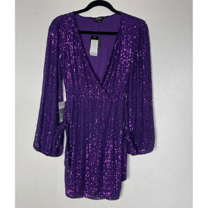 Bebe Womens Wrap Long Sleeve V Neck Sequin Tie Front Mini Dress Purple Sz XS