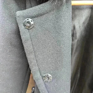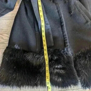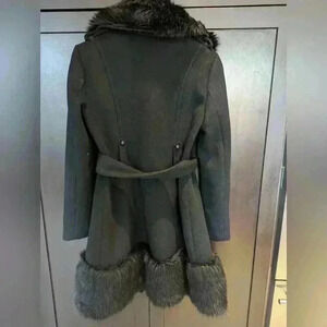 This is a beautiful lined silhouette black wool, belted faux fur at collar and hem coat with snap buttons. Worn a few times in mint condition.